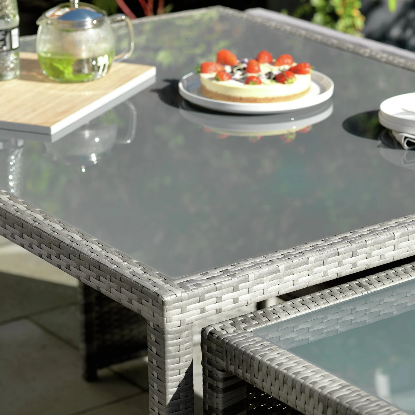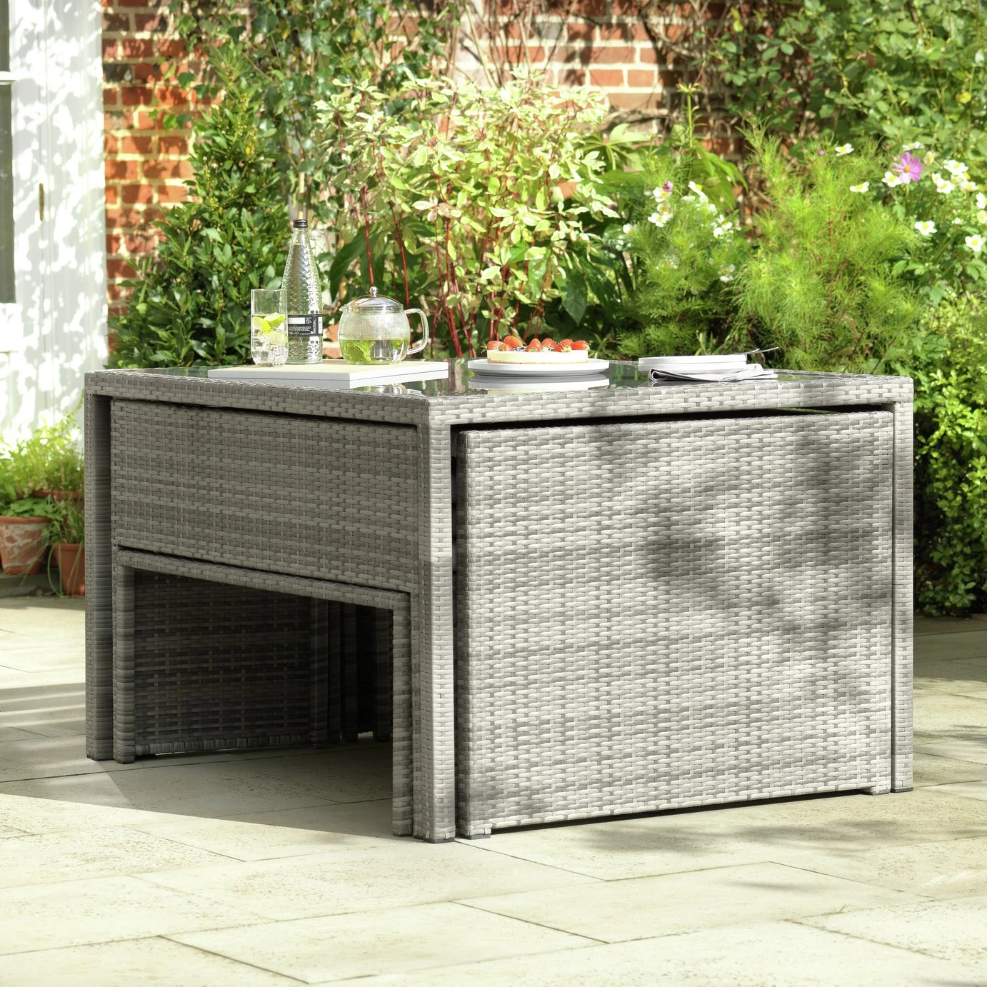 Table for 2, 4, 6 or 8? Welcome to the ultimate in flexible, foldaway outdoor dining. Our designers have had a field day with this stackable set of bistro garden furniture. Made for small gardens or balconies. It's a classic design with glass top, metal frame and rattan good looks.