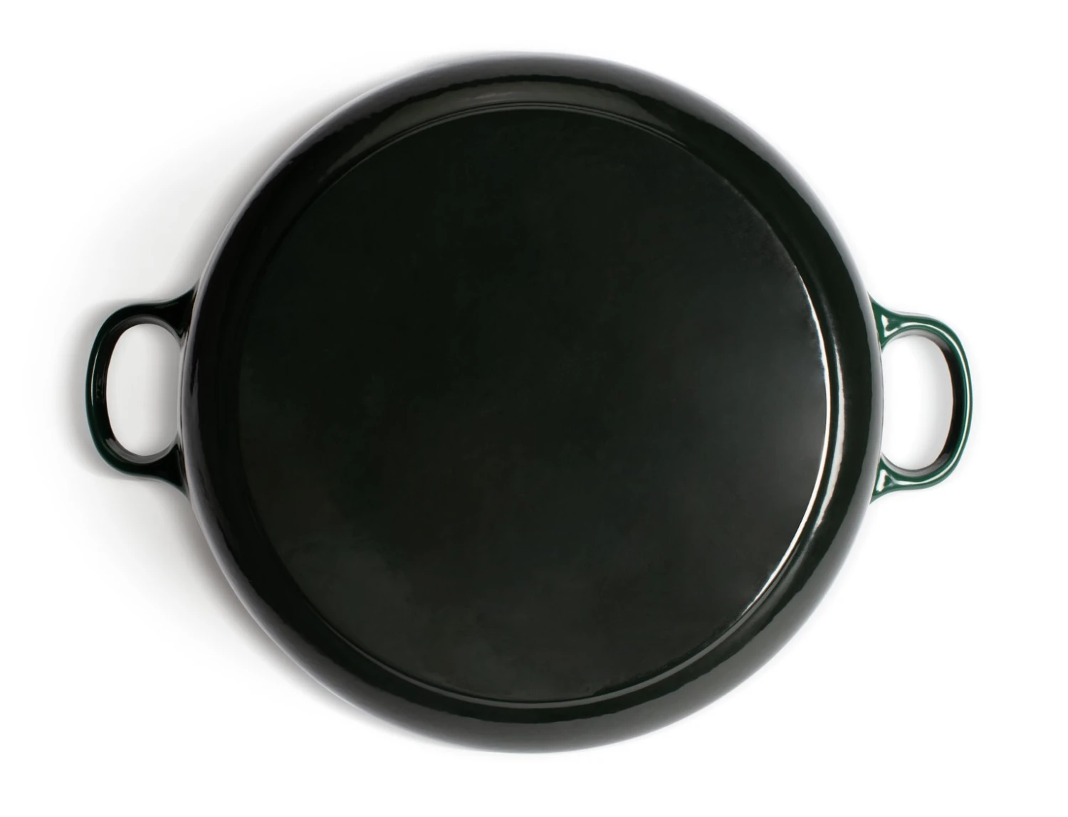 Cook and serve in style. Feast your eyes on our gorgeous green cast iron casserole dish. With its black gradient ripple effect and golden knob, it's handsome enough to take straight from the oven to the table. And being cast iron it cooks evenly and retains heat for longer. So goodbye burnt bits and hello hot meals. It has an enamel coating which makes it easier to clean, too. What a dish.