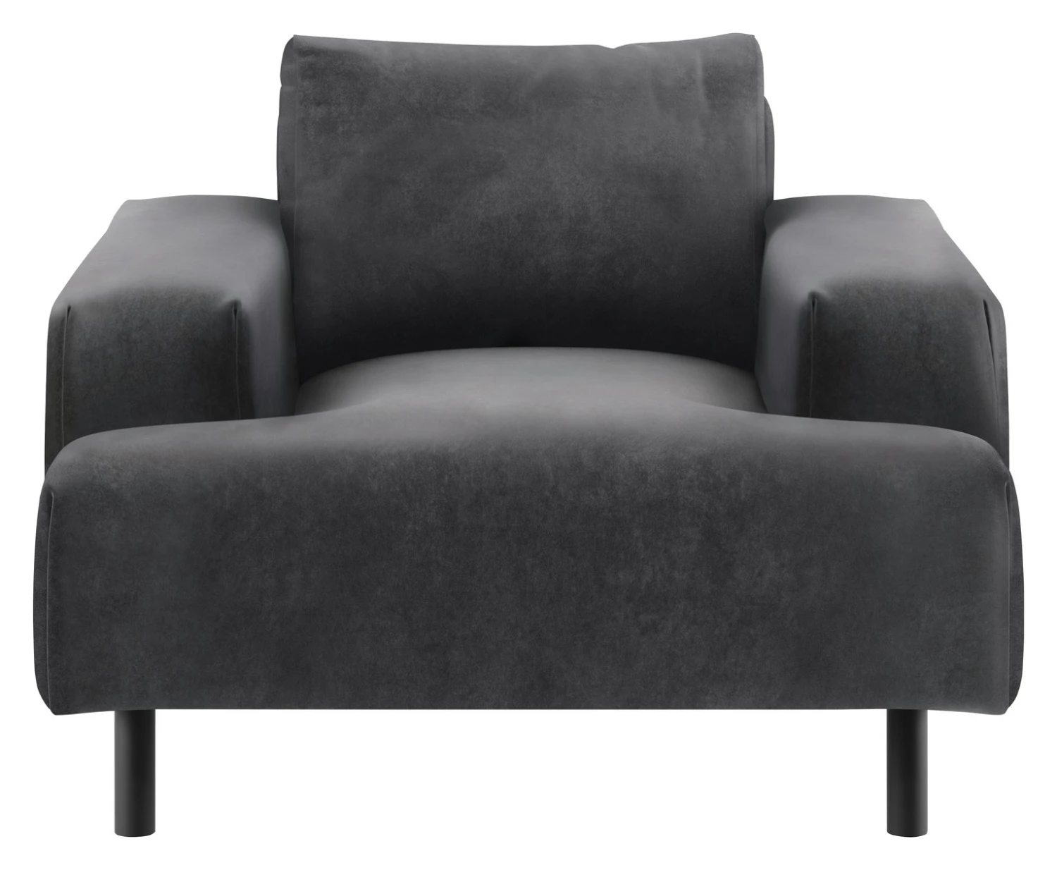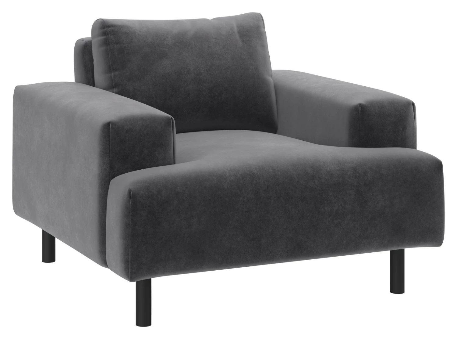 With its boxy, masculine shape, generous proportions and wide arms, the Julian charcoal velvet armchair sofa is a handsome, confident design. The sociable sofa has t-shaped seat cushions with a smooth wrapped front filled with foam for a firm sit and pillow-like, foam back cushions.